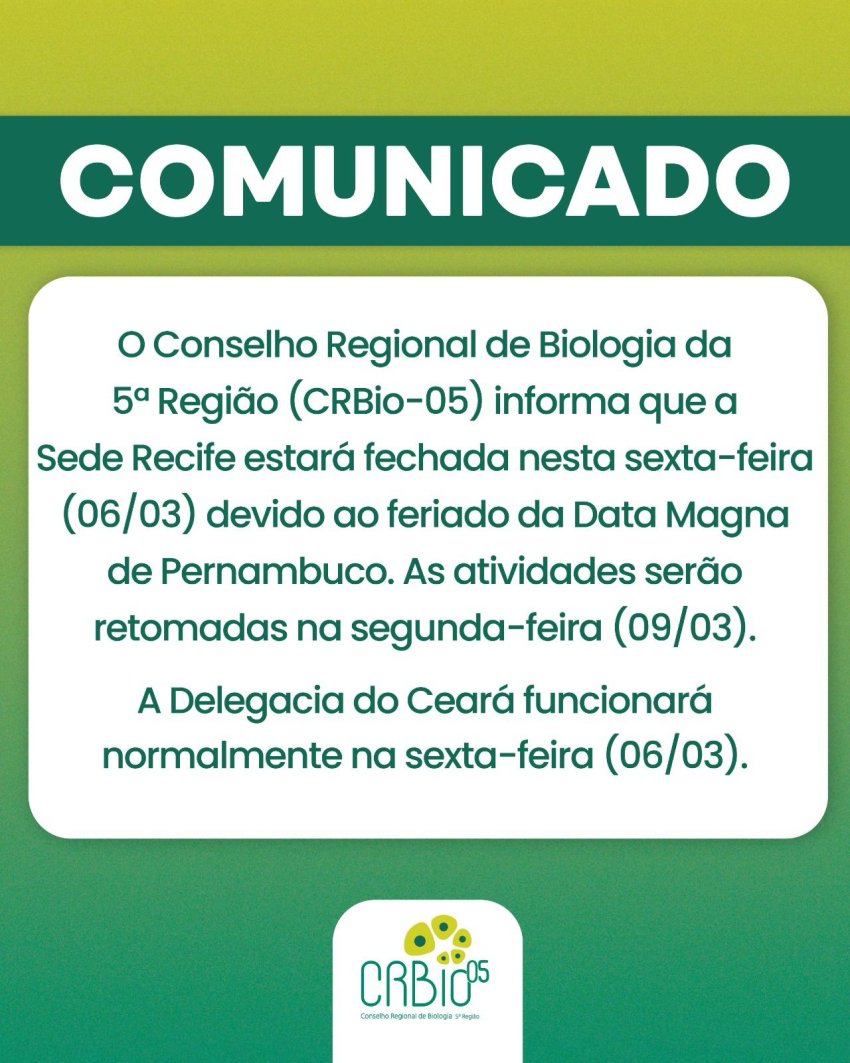 O Conselho Regional de Biologia da 5ª Região (CRBio-05) informa que a Sede Recife estará fechada nesta sexta-feira