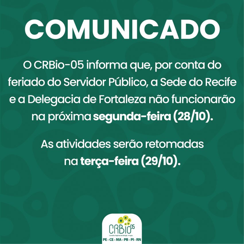 O CRBio-05 informa que, por conta do feriado do Servidor Público, a Sede do Recife e a Delegacia de Fortaleza não funcionarão na próxima segunda-feira (28/10).
