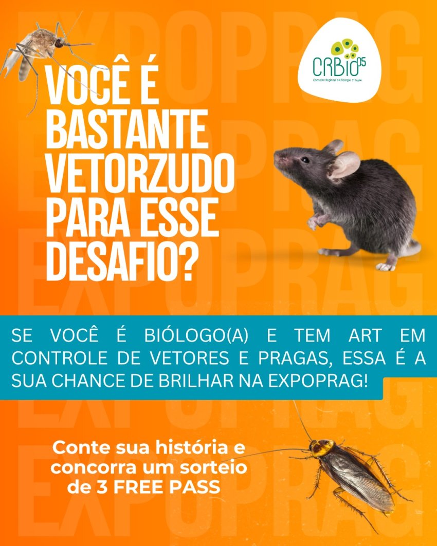Atenção, Biólogos(as) Ativos/Regulares com ART na Área de Controle de Vetores e Pragas! O CRBio-05 quer valorizar quem está na linha de frente e vai sortear 3 Free Pass para a Expoprag NO/NE 2025 que esse ano será realizada em Fortaleza, nos dia 28 e 29 de agosto.